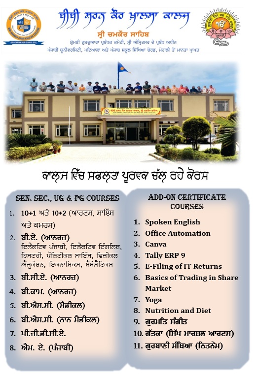 Shiromani Gurdwara Parbandhak Committee (SGPC), Sri Amritsar Sahib, the apex body of the Sikhs, with the primary objective of inculcating high ethical values, humanistic outlook, healthy habits and scientific temper among the community, has opened various educational institutions. SGPC which strives for excellence aims at producing not only successful professionals, managers and entrepreneurs but also responsible human beings who care for core human values and ethics. The major contribution of S.G.P.C. lies in providing school and college education accessible to common and needy people in remote and rural areas of Punjab and other states of India. In this direction, an endeavour of SGPC has been the opening of Bibi Sharan Kaur Khalsa College in the historical town of Sri Chamkaur Sahib to commemorate the supreme martyrdom of Bibi Sharan Kaur who holds immense relevance in the Sikh history in the cremation of the two elder Sahibzadas and Sikh martyrs during the historic fight of Mughals and the Sikh army on the sacred land of Sri Chamkaur Sahib. The college is committed to the students as it pledges to provide quality education as well as personality development by grooming students’ talent and leadership qualities, skill development along with imparting ethical values. The highly qualified faculty is dedicated to help students achieve their educational goals. The world-class infrastructure created on the campus provides an ambience conducive to stimulate learning and making the journey towards knowledge more effective. The architecture, classrooms, library, computing facilities, science labs, etc all blend to provide a holistic learning environment to the students.
